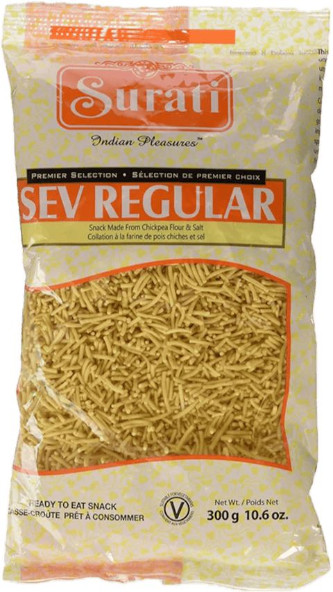 Surati Sev Regular is a traditional Indian snack crafted with a perfect blend of gram flour and aromatic spices. This crispy, savory treat features the classic thin noodle-like texture that makes sev a beloved accompaniment to meals or a satisfying standalone snack. Enjoy the authentic taste of quality ingredients in every bite.
