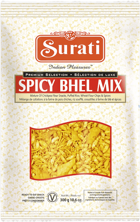 Surati Spicy Bhel Mix brings authentic Gujarati flavors to your snack time. This ready-to-eat mixture combines crispy puffed rice, crunchy chickpeas, and aromatic spices for a satisfying crunch. Perfect for quick snacking straight from the package or mixed with fresh vegetables and tamarind chutney for a complete bhel experience. A taste of traditional Indian street food in convenient form.