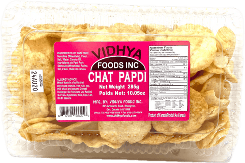 Vidhya Chaat Papdi are crispy, thin wafers designed for traditional Indian chaat preparations. These light and crunchy snacks pair perfectly with tangy chutneys, yogurt, and spiced potato mixtures to create authentic street food favorites. Made with quality ingredients, they deliver the satisfying crunch that makes chaat dishes so enjoyable. Ideal for entertaining guests or enjoying a classic snack at home, Vidhya Chaat Papdi brings the flavors of India to your table.